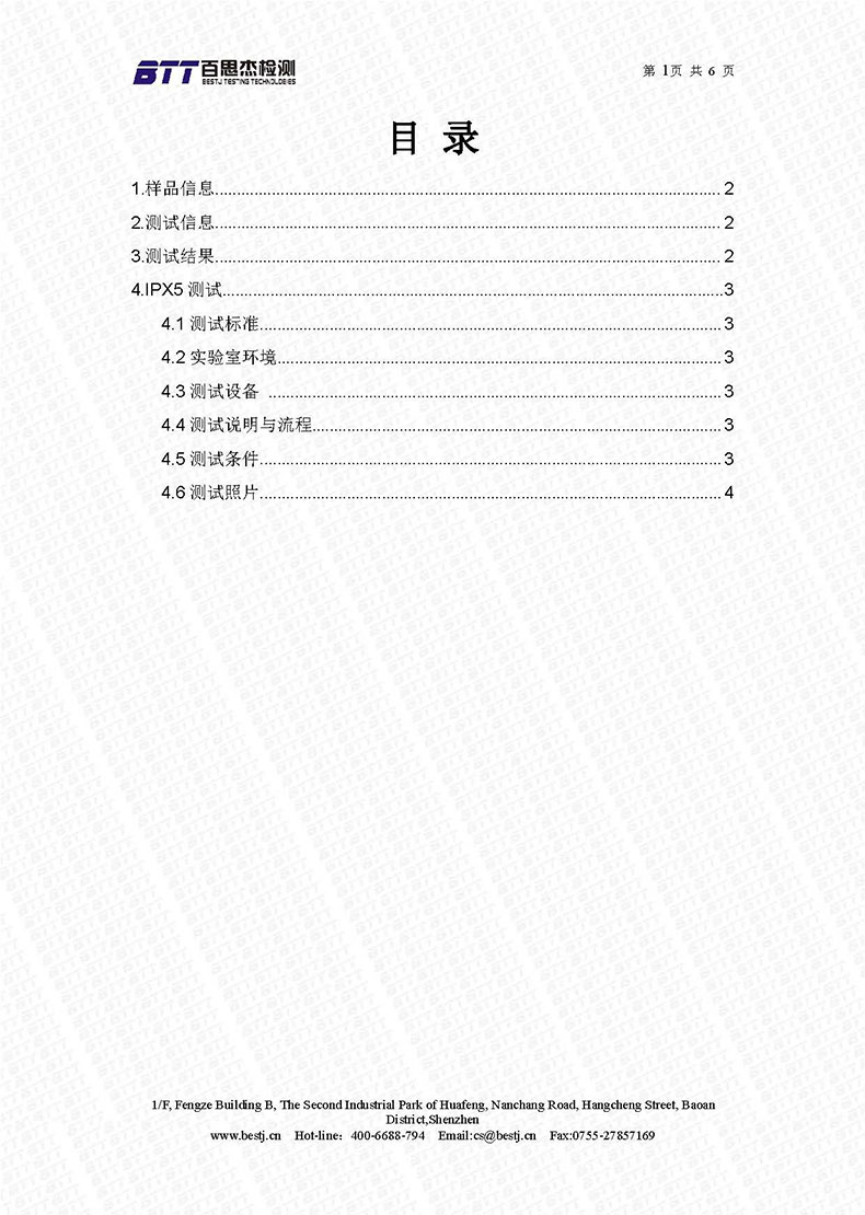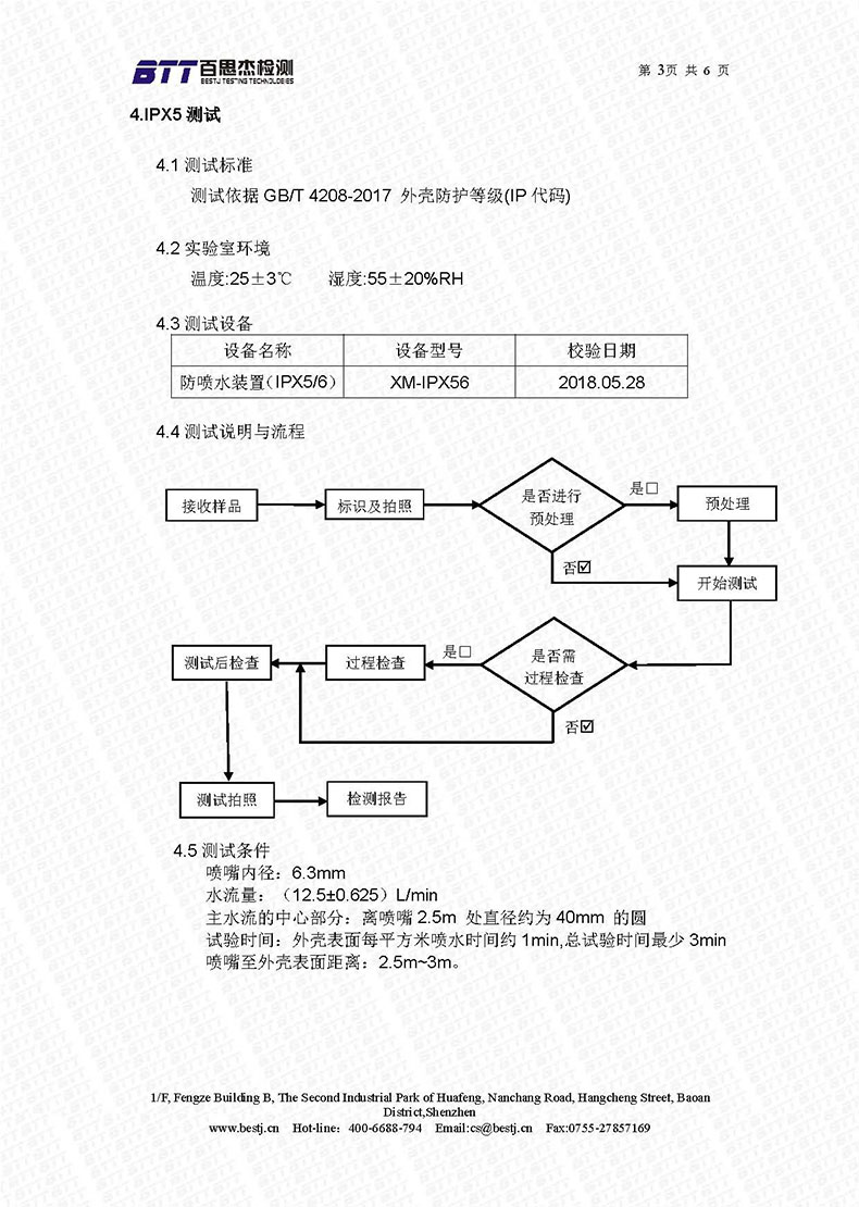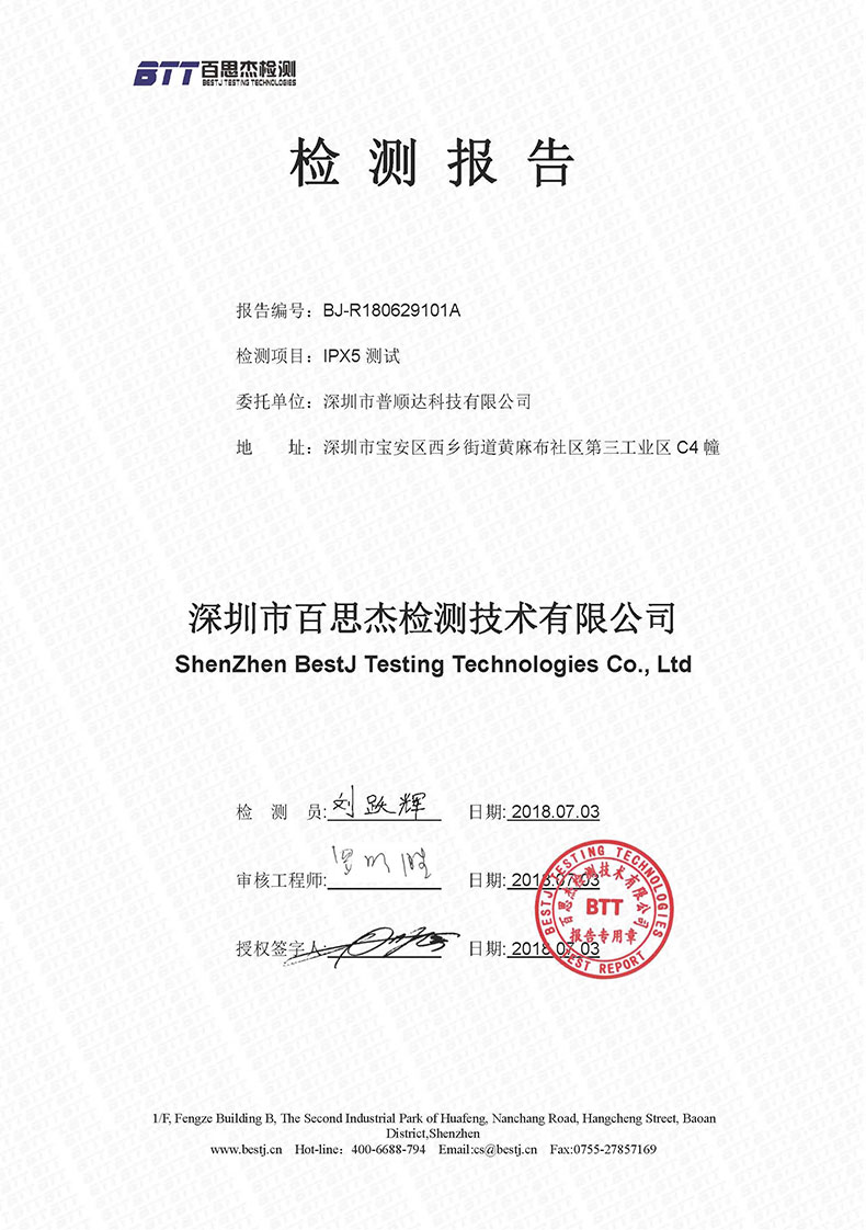 2018年7月,普順達的158型號室外槍機,通過IPX5測試,該款攝像機具有室外防水功能,下面是檢測報告。